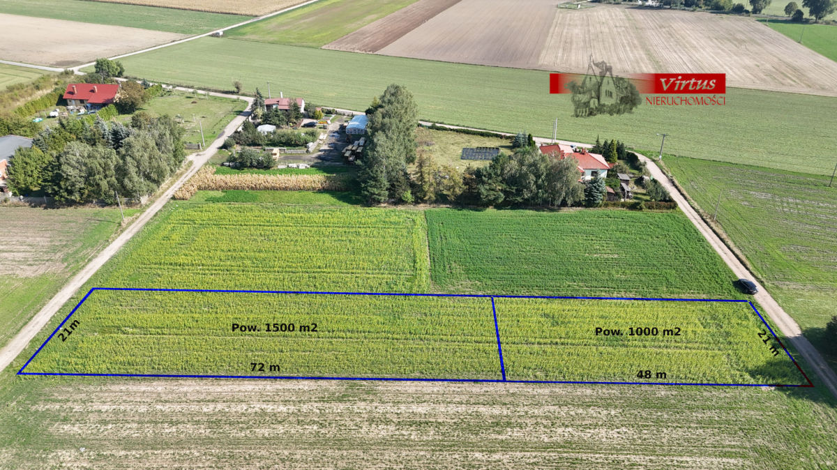 Działka w kształcie prostokąta o wymiarach ok. 21m na 72 m ma powierzchnię 1500 m2.