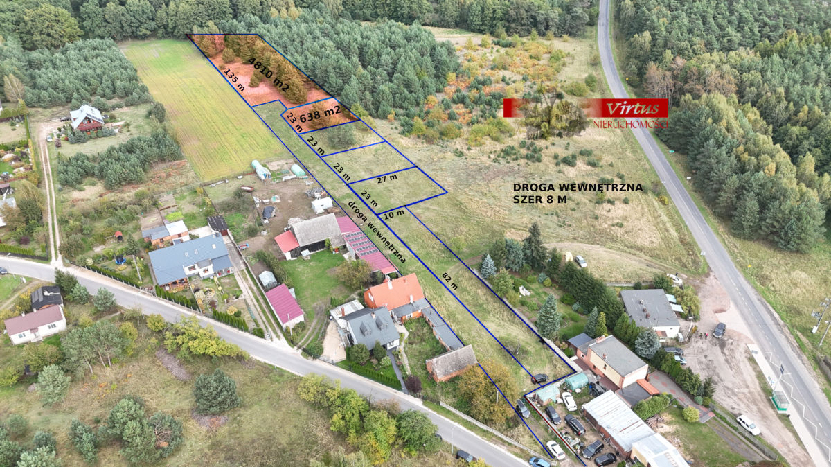 Działka składa się z dwóch działek i ma łączną powierzchnię 5448 m2 z czego na działkę o powierzchni 638 m2 wydane zostały warunki zabudowy wskazujące budowę budynku mieszkalnego jednorodzinnego. Pozostała działka (4810 m2) bez prawa zabudowy.